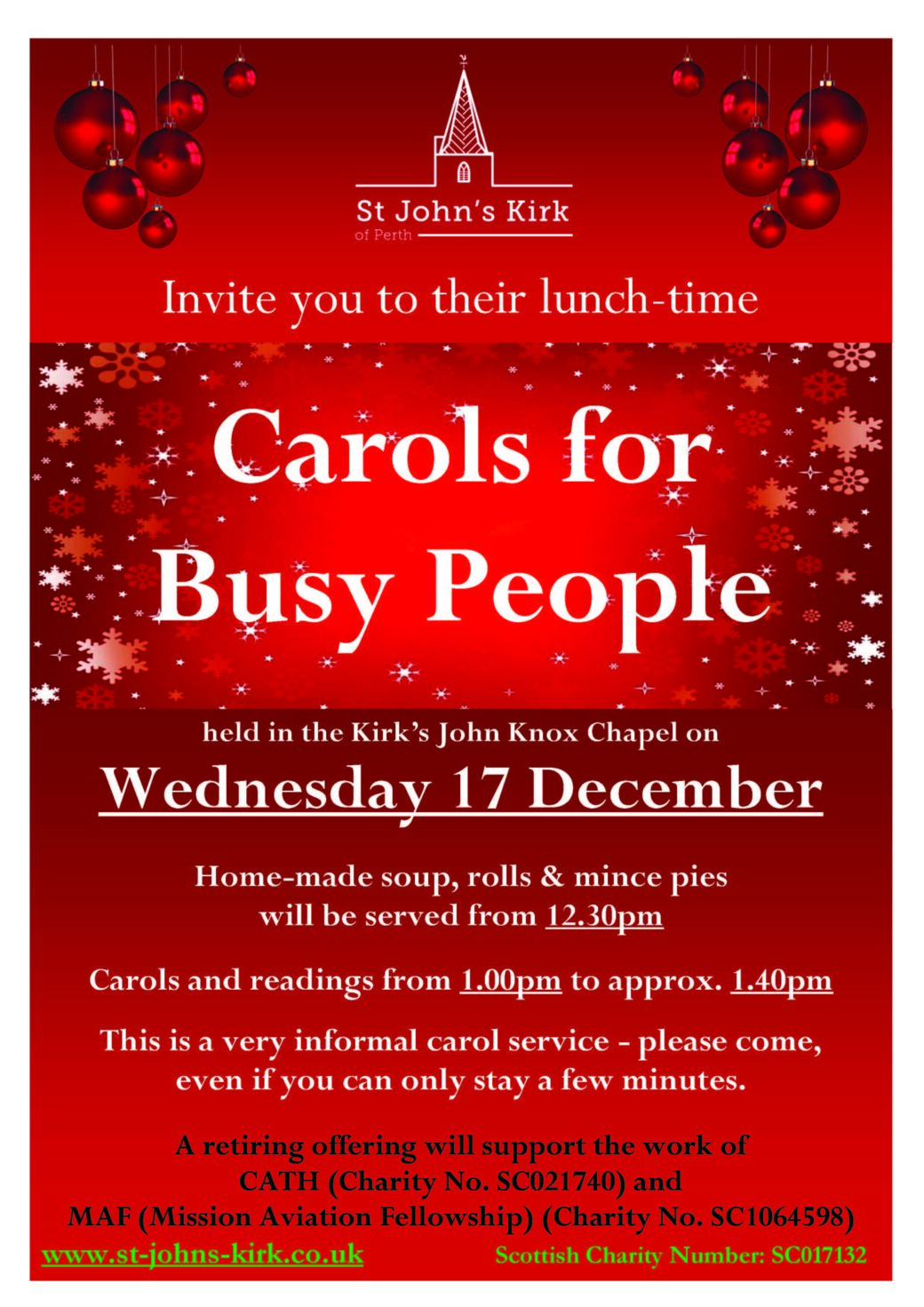 Carols for Busy People Wednesday 17 December 2025St John’s Kirk of Perth12.30pm – Home-made soup, rolls & mince pies1-1.40pm – Carols and Readings